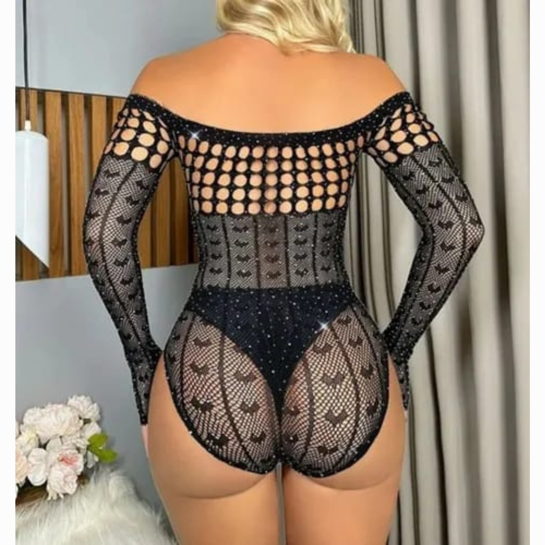 Los detalles calados y los brillos tipo strass aportan un toque glamuroso y seductor, creando un juego visual que captura la luz y las miradas desde cualquier ángulo. Las mangas largas ajustadas equilibran perfectamente la sensualidad del diseño, añadiendo un aire sofisticado y moderno.